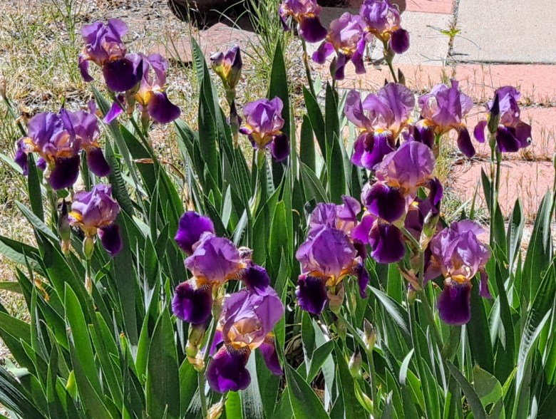 I took a few photos when I was out watering this morning. These irises aren’t mine; they are growing in my next-door neighbor’s yard, though they might as well be mine since there’s no one else to see them. It amuses me to think that I spend so much time outside watering and grooming my yard, and his totally unkempt (well, not totally — he does mow the weeds a couple of times during the summer) and completely unwatered yard yields these majestic flowers.
