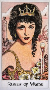 One of the cards that turns up frequently is the queen of wands. The court cards (the face cards) are traditionally linked to those asking the question of the cards. In some readings, the court cards are removed except for the card that most represents the querent. (The querent is the one asking the question.) I’d like to think that the queen of wands represents me, both for what I know I am as well as what I would want to be. For example, the queen of wands is adaptable, kind, generous, warm-hearted to her friends, intelligent and capable. Her ways of thinking are varied and complex, but she can grasp the moment and make what she wants of it.