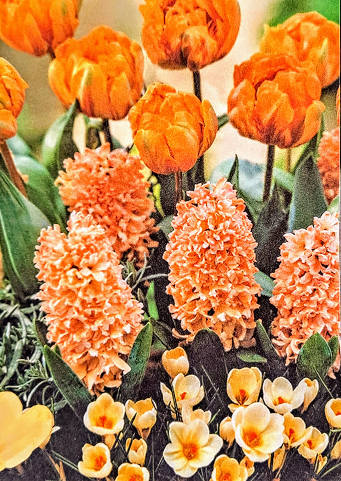 In my defense, I received a flower catalog yesterday, and though the gardens portrayed made me envious, I set aside the catalog and didn’t order from it, so perhaps my will power was all used up, and that’s why this gorgeous sunset-colored collection of bulbs got to me.