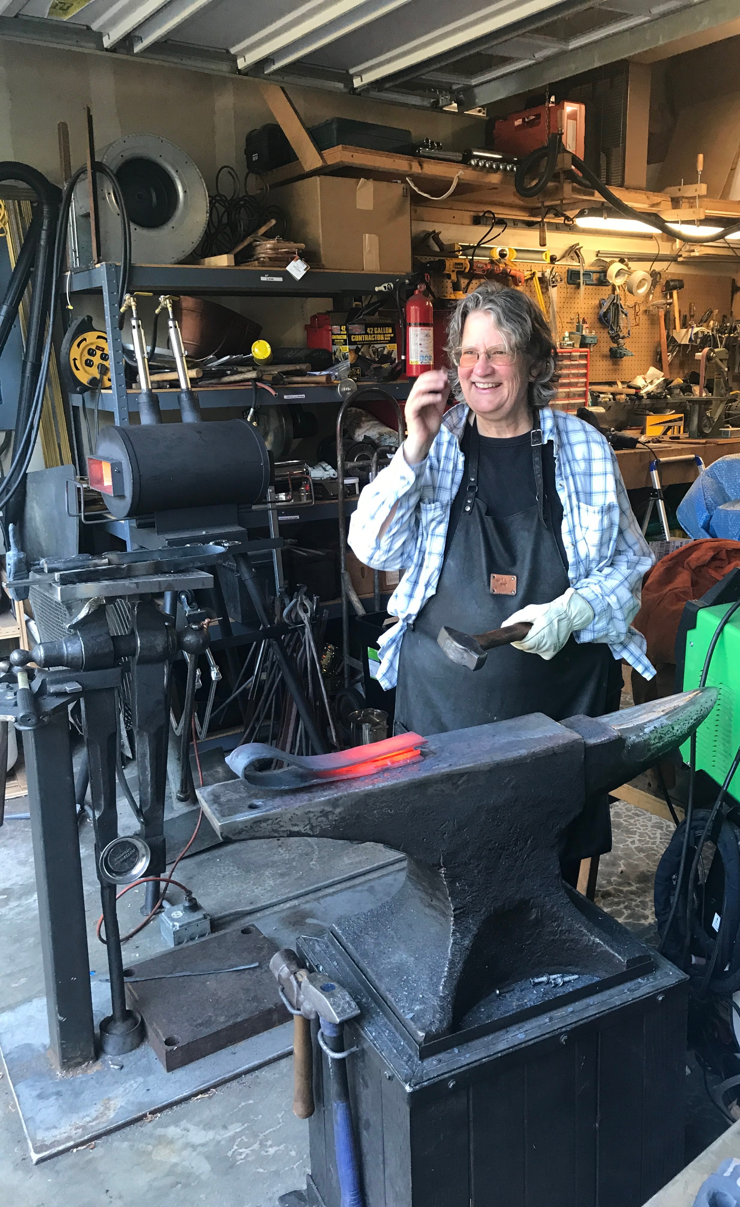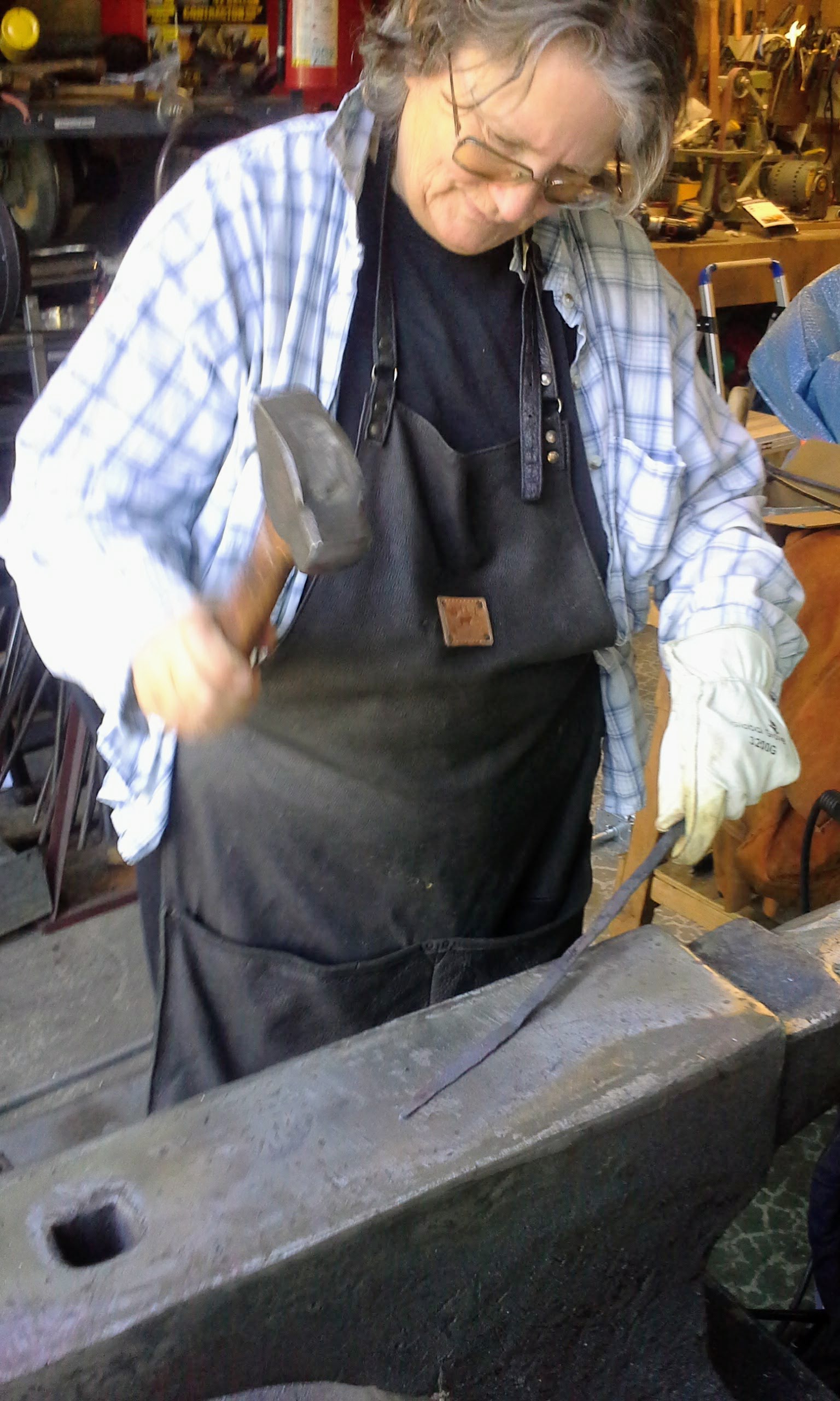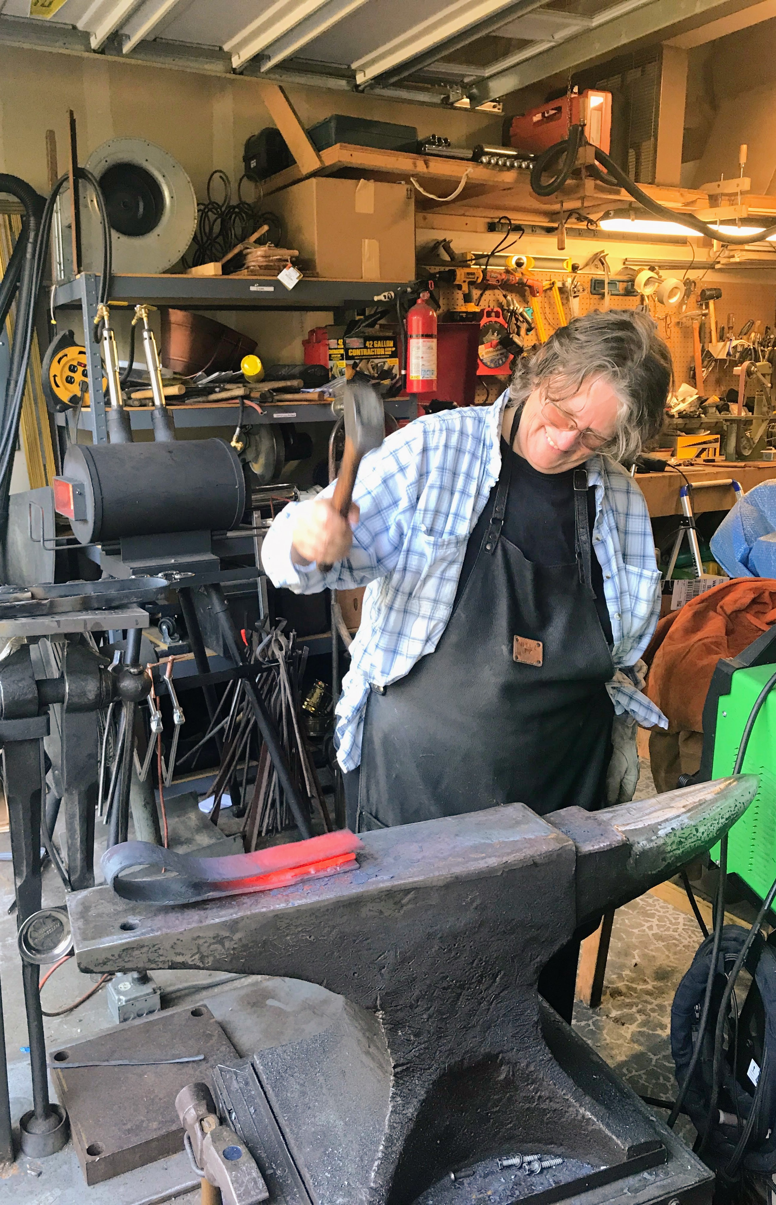 A blacksmith shop, with the huge bellows hanging from the ceiling on the upper right and attached to the adobe stove on the left