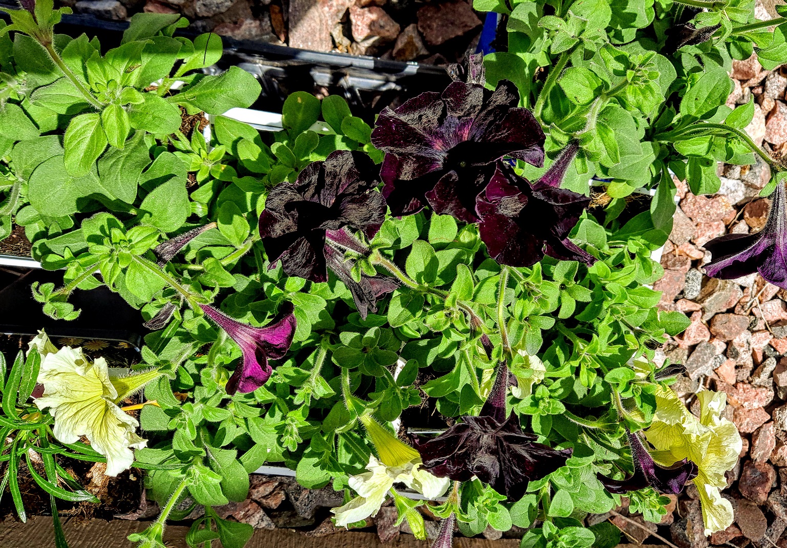 I also got a few cream-colored petunias to plant with the black for contrast. It’s funny to think I spent all that money to keep from wasting a few dollars-worth of soil, but having to use the soil did give me a reason to buy more plants.