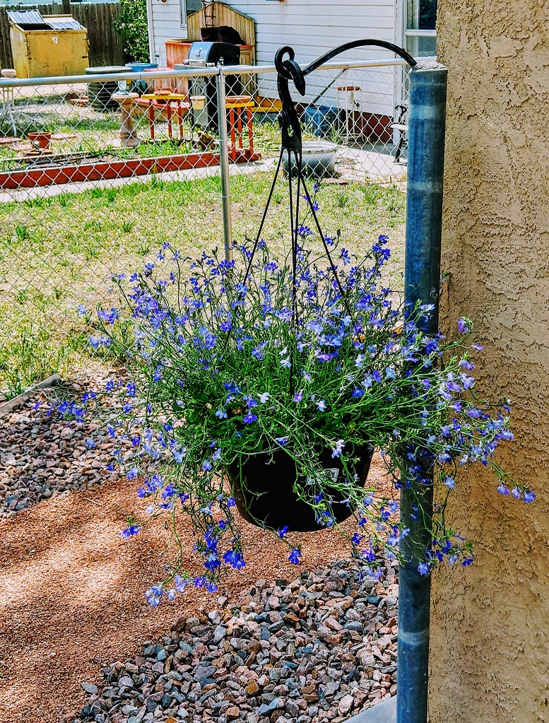 The easiest part of the planting was the hanging plant. All I had to do was hang it on a hook. The pole for the hook was a fence post that got cemented into the foundation of the house. When the old fence was taken out and the new fence around the whole property put in, the post remained. A hook, a bit of cement, and the fencepost became something completely different!