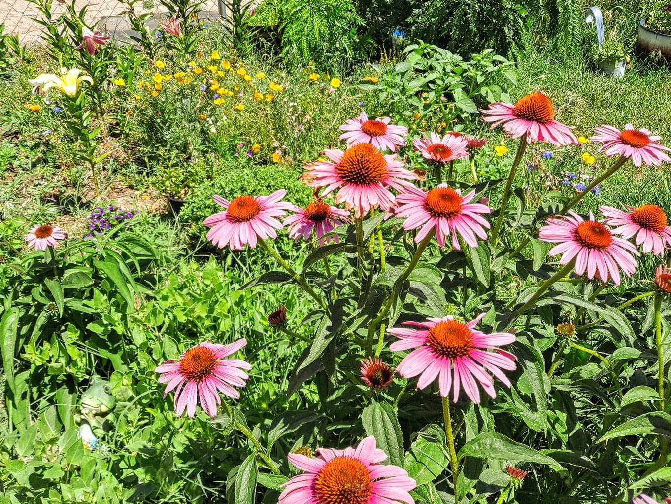 Despite my frustration, struggling plants, and problems with weather, there are still many things to enjoy in the yard. Right now, it’s mostly daylilies and echinacea, but a sunflower or two are also flowering.
