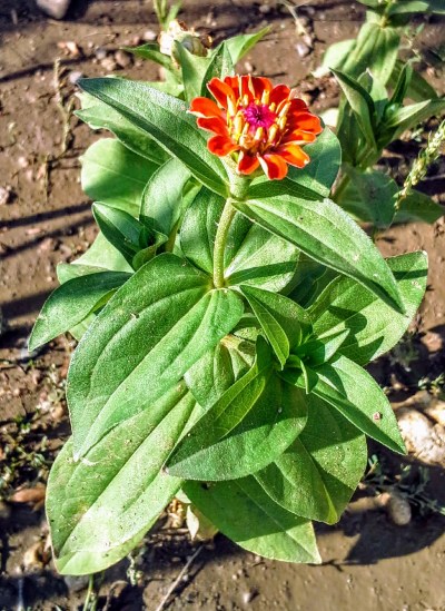 I do know what this little dime-size flower is, thanks to a gardener who reads my blog. Just seeing the photo, which disguises the size of the bloom, it’s easy to see it’s a zinnia, though where it came from, I don’t know. It did make me think that maybe next year I should plant a patch of zinnias since they seem to like it here.