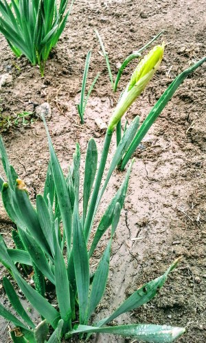The miracle patch of bulbs that came up all on their own (miracle because I dug them up last fall and planted them elsewhere turn out to be daffodils! I can hardly wait to see this beauty open.
