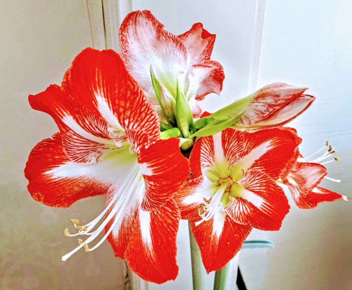 One of the plants that was gifted in the group plant exchange was an amaryllis. I don’t think I’ve ever seen one in real life, so I have enjoyed seeing the flowers bloom. Not only are they spectacularly pretty, but they brightened the dreary winter days we’d been having. Too bad they don’t grow outside in Colorado. I’d certainly love to see a whole garden filled with such gems! Still, being able to see even one amaryllis plant in bloom is a joy.
