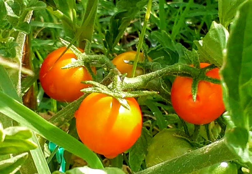 A couple of my cherry tomato plants seem to be dying, but a couple are doing so well that I was able to harvest a tomato off one of the plants.