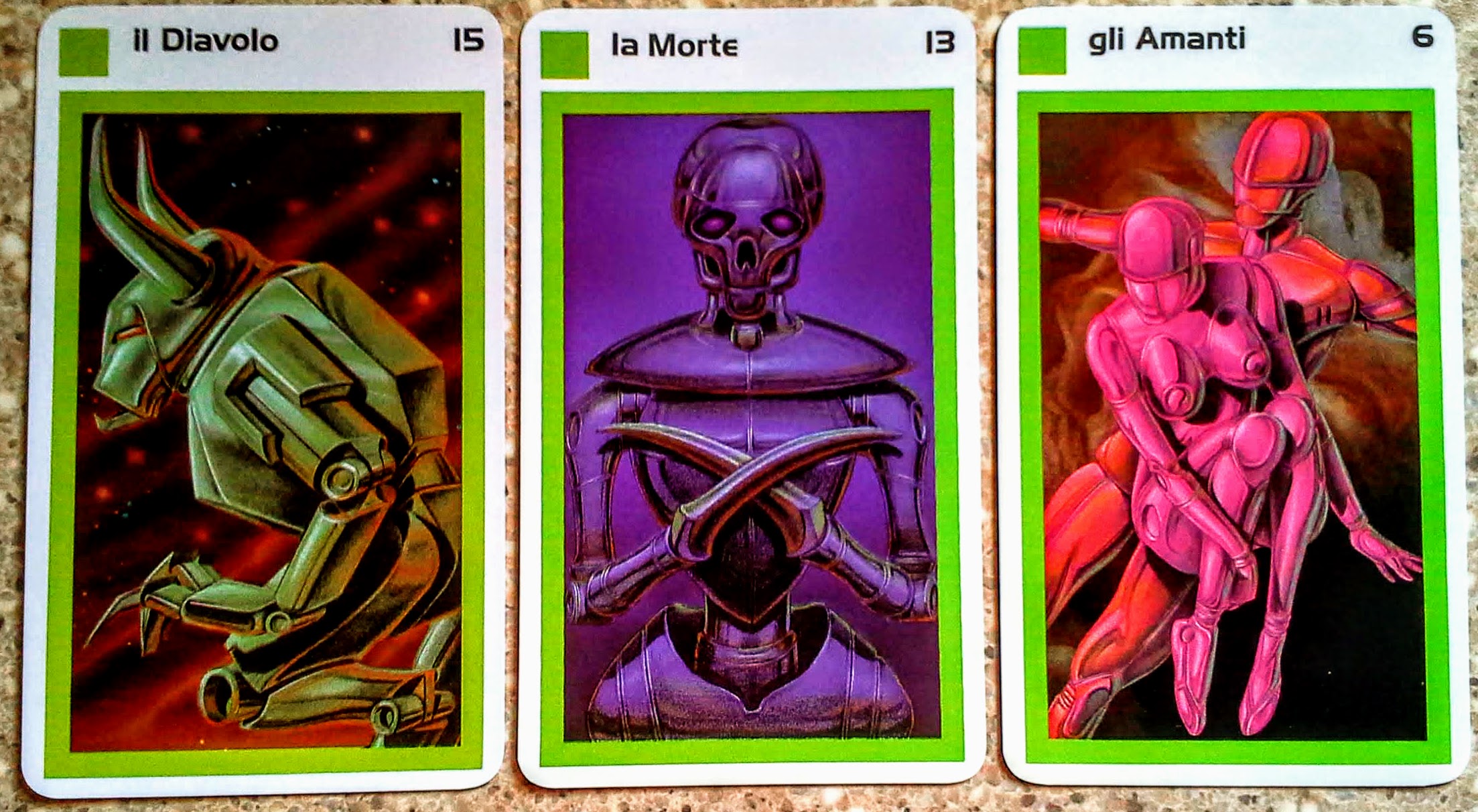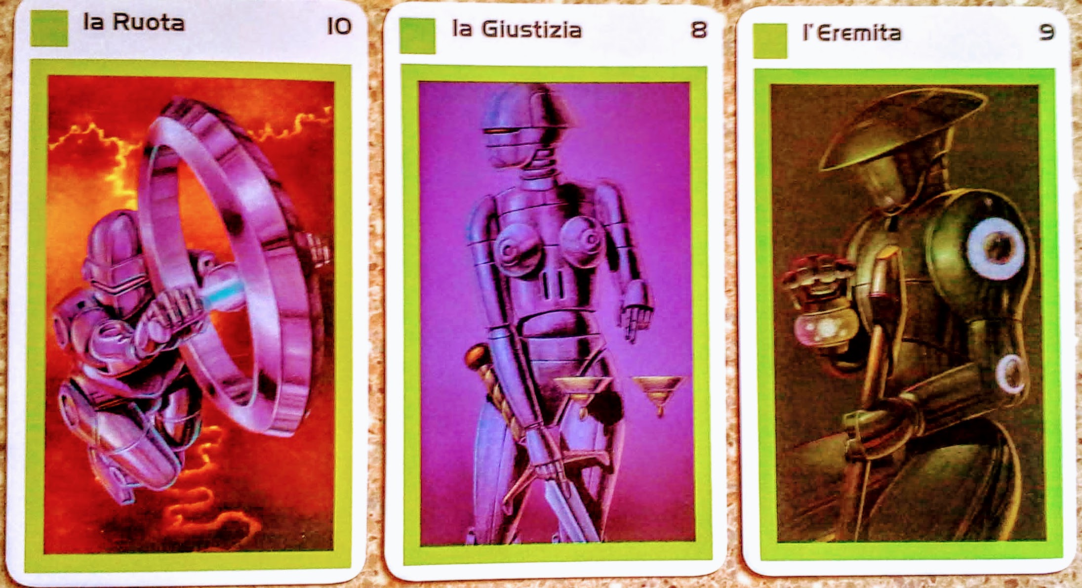 I’ve been translating a booklet written in Italian that came with a deck of tarot cards, I Tarocchi di Robot. I thought it would be easy using MS Word translator and Google translator — just type in the text. And it was easy. Mostly. There were places of disagreement between the two translations, and even some words that seemed wrong in both translations. I’m pretty sure the writer meant suit of cups and suit of wands rather than seed of cups and seed of wands as presented in both translations, though who knows. When it comes to the tarot, people seem to like being mysterious simply for the sake of being mysterious. So I had to do some translation of the translation, if you know what I mean.
