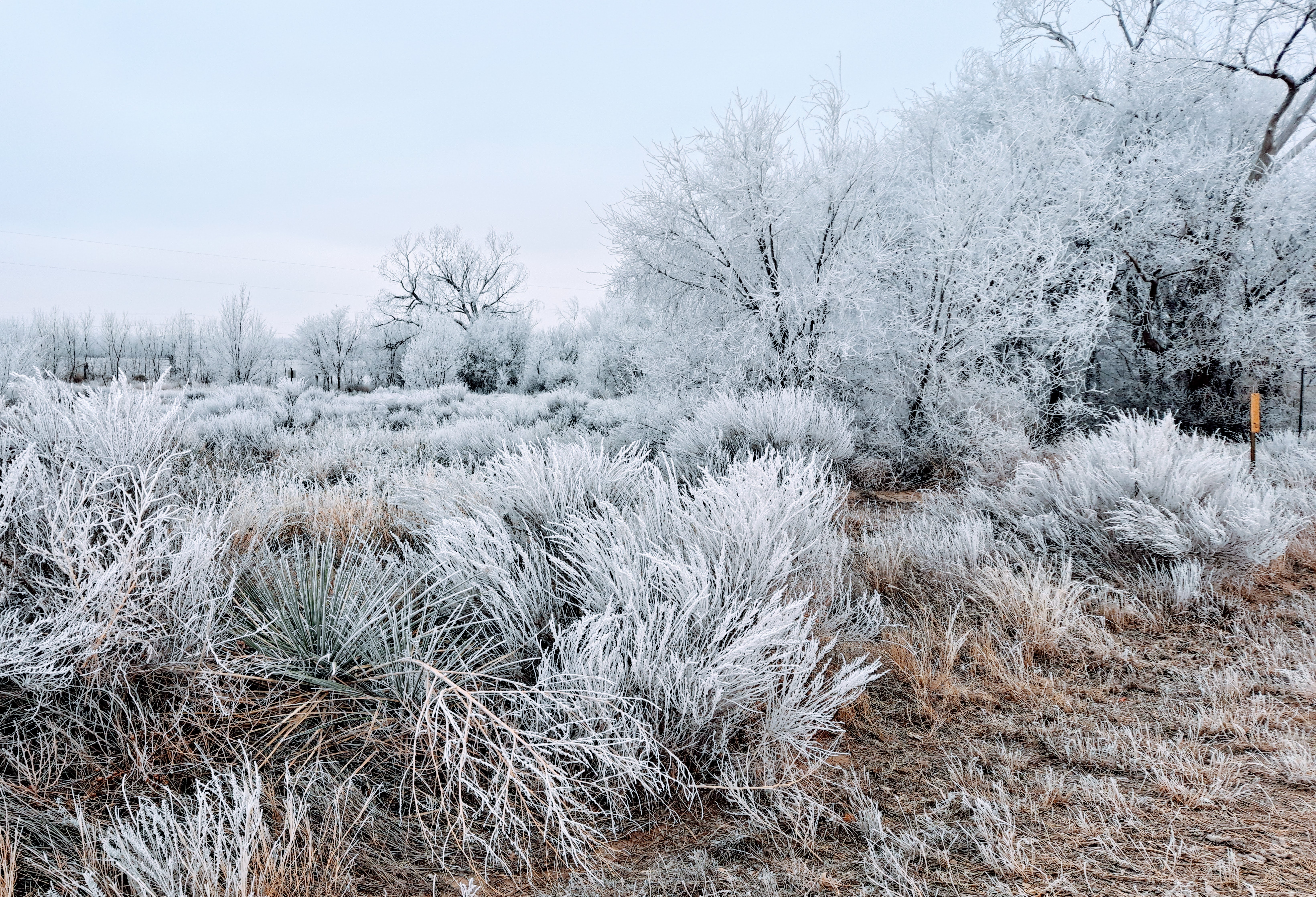 The sublime part of today (and the past couple of days) was the frozen fog. I don’t remember if I’d ever seen frozen fog before, though perhaps I did when I was young because the scene has a familiarity about it. I certainly hadn’t seen anything like it when I lived in the desert of California or the high plains of Colorado, so I enjoyed the whiteness. The white trees and shrubs, the white sky, the white . . . everything. It looks like snow, but it isn’t — we haven’t had snow for a couple of weeks. Apparently it’s cold enough (and yes, it is cold, though not as cold as it’s going to be this weekend; they’re talking about a high of zero on Sunday) to freeze the fog in the air and the moisture on the flora.