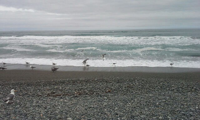 What is the difference between today and last Thursday? I’d really like to know, but I have a hunch it’s a rhetorical question. Last Thursday, I went to Kellogg Beach, and walked for six hours along Pelican Bay without seeing a single creature except for gulls. Today, there were gulls, but also dogs, horses, fisherfolk, old couples, young couples, and a couple of individuals cloud bathing. (At least I’m assuming they were cloud bathing. They were sprawled on towels on the beach, and there wasn’t a single bit of blue or spark of a sun ray in the sky.) I set out on my solitary walk anyway, but people had driven out onto the sand, so were spread out all along the beach.