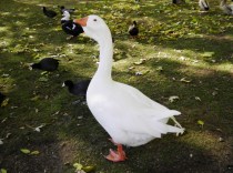 Why is a goose silly? The ancient hieroglyphic for foolish fellow is a goose, so obviously this disparagement of geese goes back to the origins of language. I’ve met a few geese recently, and I have yet to see one do anything silly. They look arrogant (as you can see from the photo I took today). They seem very goal-oriented (when food is in the offing, they hasten to get their share). And they are a bit intolerant of other species of fowl who might also be after that food. But silly? No. In fact, they are very smart and loyal. They fly in a V-formation, which is the most efficient way to travel. The lead geese do the hard work, breaking wind resistance so the geese trailing behind get a bit of rest, and they rotate positions, so none get too tired or too lazy. They also mate for life, which is more than you can say for a lot of humans. So why silly as a goose? Why not silly as a seal? Or silly as a dolphin? Or silly as an otter? All of those creatures are subject to antics, though of course, that might be our human perspective rather than the truth.