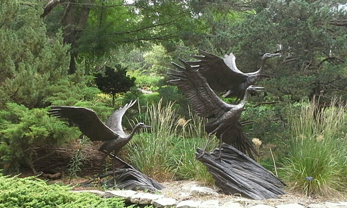 In Kansas, which has the reputation of being a rather boring state, I have been beguiled by the scattered sculptures that enhance the natural beauty of the Wellington and Wichita area. A herd of unheard horses thundering across a lawn. Children reading. Water fowl taking flight. A blue heron all but hidden in the reeds. These photos are below.