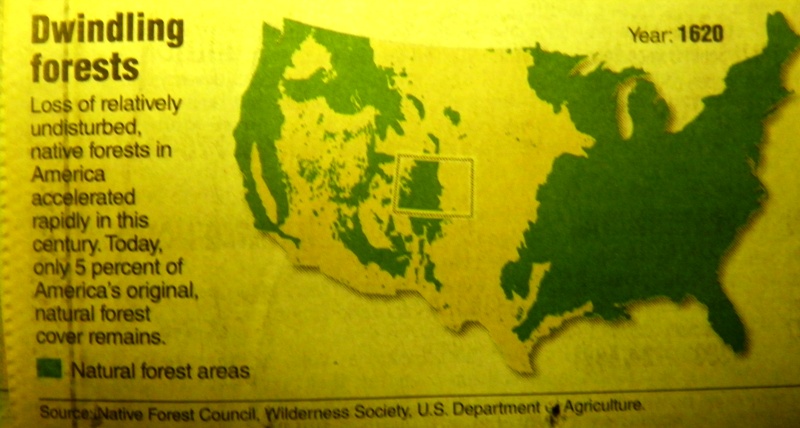 I’m glad I did. I came across the photos posted below, photos that took my breath away. I remember reading stories in grade school history and reading classes about settlers, and the stories always seemed to begin or end with the hardy souls cutting down trees and clearing the land. This legend was so ingrained, it wasn’t until my twenties I realized the truth. What????? They cut down trees for farmland????? Trillions and trillions of trees — for what? The American dream of owning a piece of land? The insanity of it all is . . . well, insane. Yes, I know — persecutions in Europe, religious and political freedom, etc, etc, etc, but unconscionable for all that.