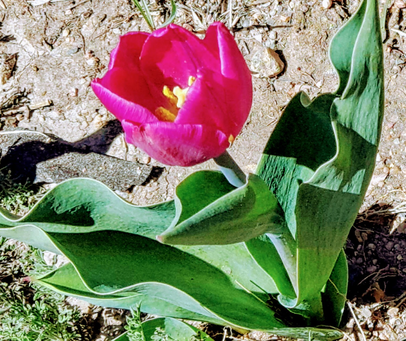 One thing I didn’t do was take a photo of the pretty tulip that bloomed today because I didn’t have to. I’d found the tulip in my yard last year and took a picture of it before transplanting it among the rest of the tulips. It looks exactly the same this year, so I’m using last year’s photo. Oddly, the photo was taken on this very same day last year.