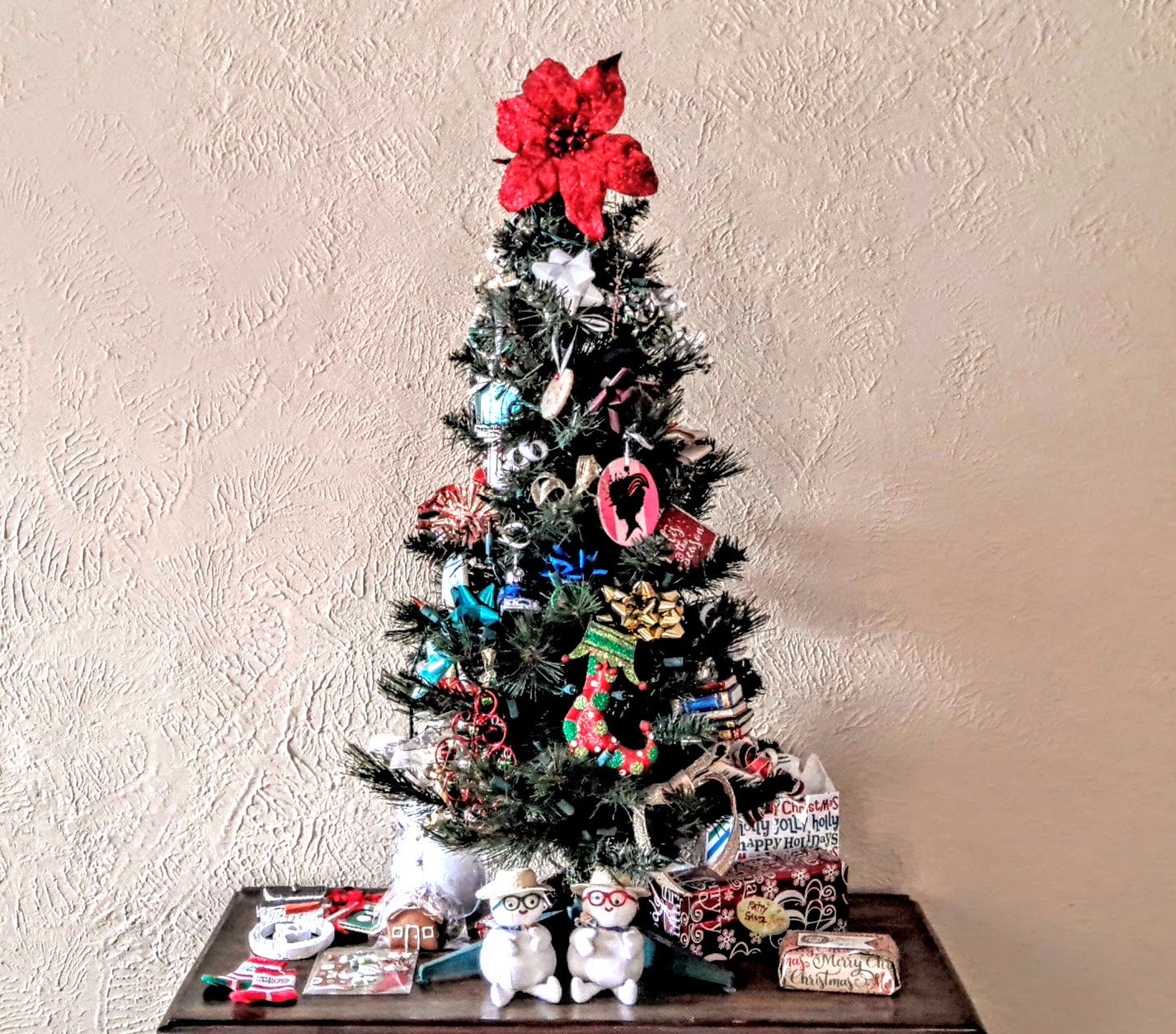 I hadn’t planned to decorate for Christmas this year — I just don’t seem to be able to scrape up any sort of celebratory spirit — but after seeing how a friend who had recently been left alone after the death of her husband still managed to decorate her house with hundreds of ornaments and other Christmas collectibles (Santas, Christmas mice, Christmas teddy bears, votive candle holders) I figured I could put up one little tree.