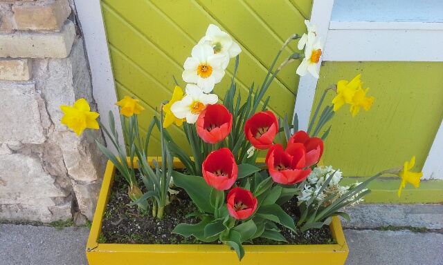 Putting the final touches on the picaresque peninsula, bits of art and daphodils peeped out wherever you look. (Apparently once there had been a fundraiser to sell naturalizing daffodil bulbs, and people planted them in usual and unusual places.)